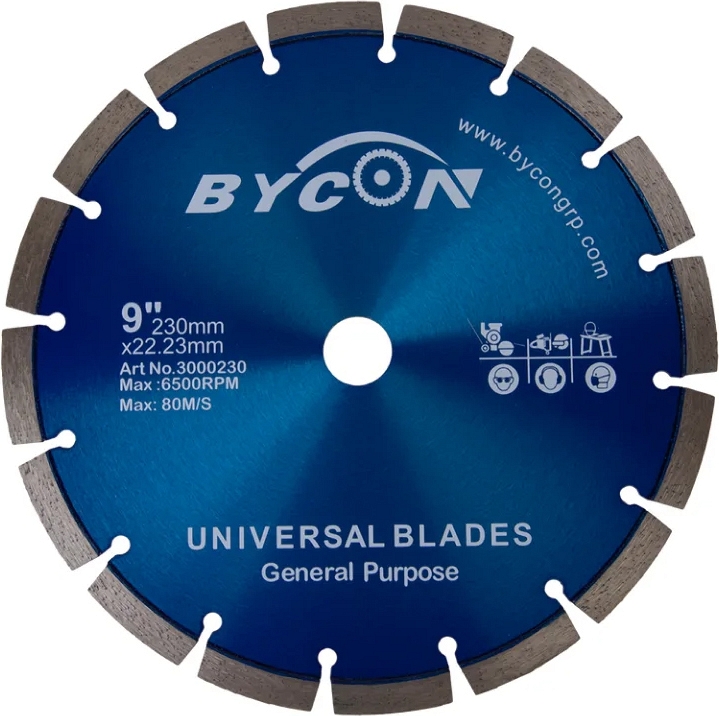 Алмазный диск Bycon Laser Uni 230 мм (Байкон Лазер Уни 230 мм) применяется, как правило, на угловых шлифовальных машинах (ушм, болгарках), штроборезах, бензорезах, электрических резчиках, стенорезных машинах и плиткорезах электрических. Обрабатываемые материалы: бетон, армированный железобетон, гранит, природный камень, клинкерный кирпич (клинкер) и другие материалы.