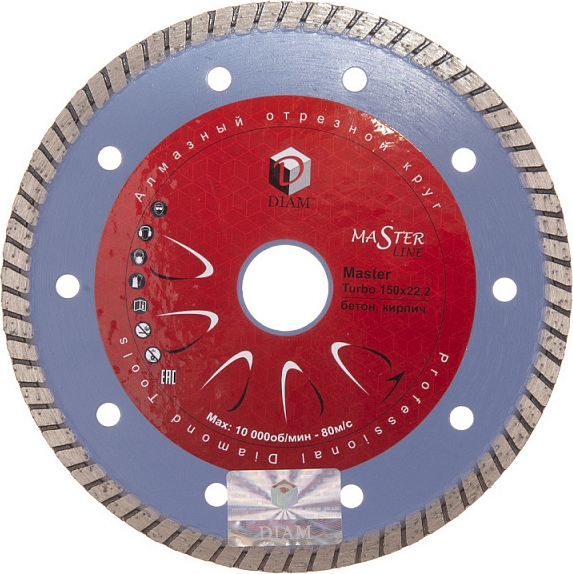 Алмазный отрезной круг Diam Master Line Turbo Master 150 мм (Диам Мастер Лайн Турбо Мастер 150 мм) – профессиональный алмазный диск для сухой резки бетона, слабоармированного бетона, огнеупоров, кирпича, тротуарной плитки, общестроительных материалов.