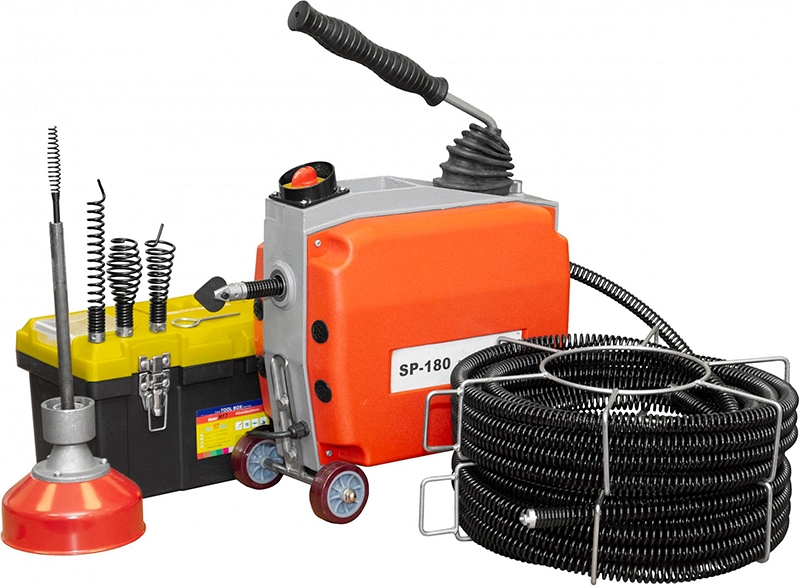 Машина для прочистки канализации Crocodile SP-180B Set 16 мм × 5 м × 7 шт. (Крокодил СП-180Б Сет 16 mm × 5 m × 7 pc.) секционного типа с электрическим приводом предназначена для прочистки канализационных труб Ø 20 – 125 мм, длиной до 35 м. Используется в эксплуатационных компаниях, аварийных службах, медицинских, детских учреждениях, сегменте HoReCa, на производстве, в крупных предприятиях и на транспорте в широком диапазоне эксплуатируемых систем канализации и дренажных труб.