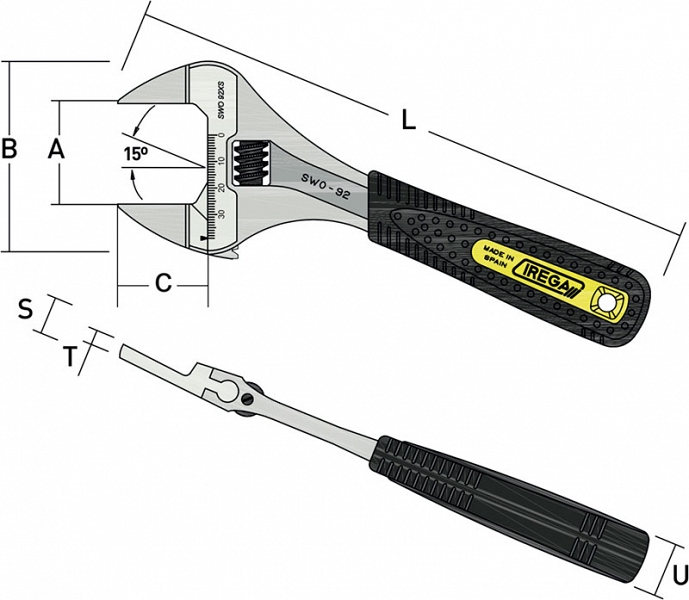 - Супер широкое раскрытие губок (Super Wide Opening – SWO) – 34 мм (1 3/8"): на 78% шире, чем у аналогичных по раскрытию губок стандартных разводных ключей!