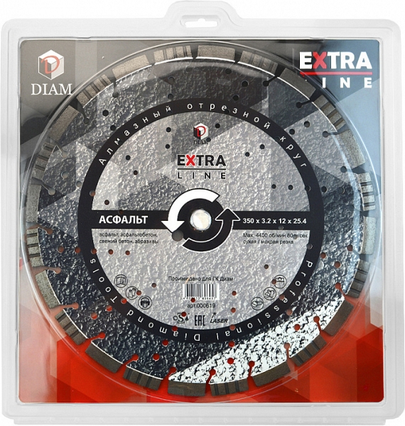 Сегментный алмазный круг Diam Extra Line 1A1RSS Turbo Асфальт 350 мм (Диам Экстра Лайн 1А1РСС Турбо Асфальт 350 мм) – профессиональный алмазный отрезной диск с лазерной сваркой сегментов для сухой и мокрой резки асфальта, асфальтобетона, свежего бетона, пенобетона, абразивного песчаника, шамотного и силикатного кирпича, шамота и других абразивов на резчиках швов, стенорезных машинах, камнерезных станках, электрических резчиках, бензорезах, как с подачей воды, так и без нее.