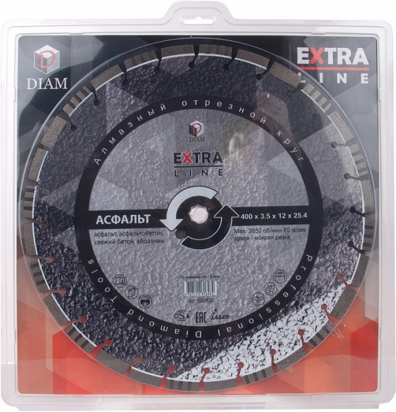 Сегментный алмазный круг Diam Extra Line 1A1RSS Turbo Асфальт 400 мм (Диам Экстра Лайн 1А1РСС Турбо Асфальт 400 мм) – профессиональный алмазный отрезной диск с лазерной сваркой сегментов для сухой и мокрой резки асфальта, асфальтобетона, свежего бетона, пенобетона, абразивного песчаника, шамотного и силикатного кирпича, шамота и других абразивов на резчиках швов, стенорезных машинах, камнерезных станках, электрических резчиках, бензорезах, как с подачей воды, так и без нее.